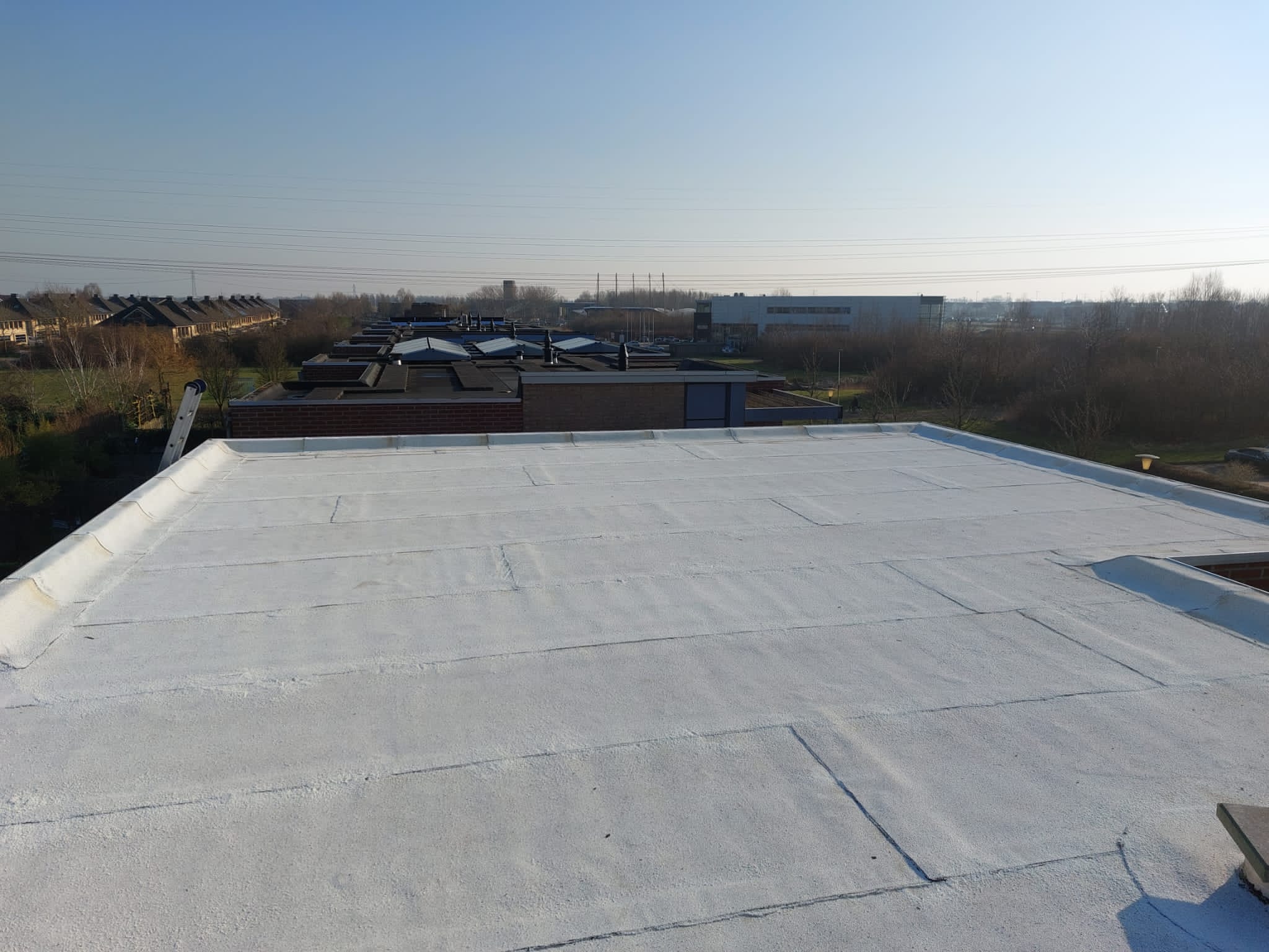 Witte bitumen over bestaand dakleer van een bedrijfshal aangebracht. Hiermee slaat de klant 2 vliegen in 1 klap: Het dak weer waterdicht, en bij warm weer minder hitte binnen waardoor de airco minder hoeft te koelen.